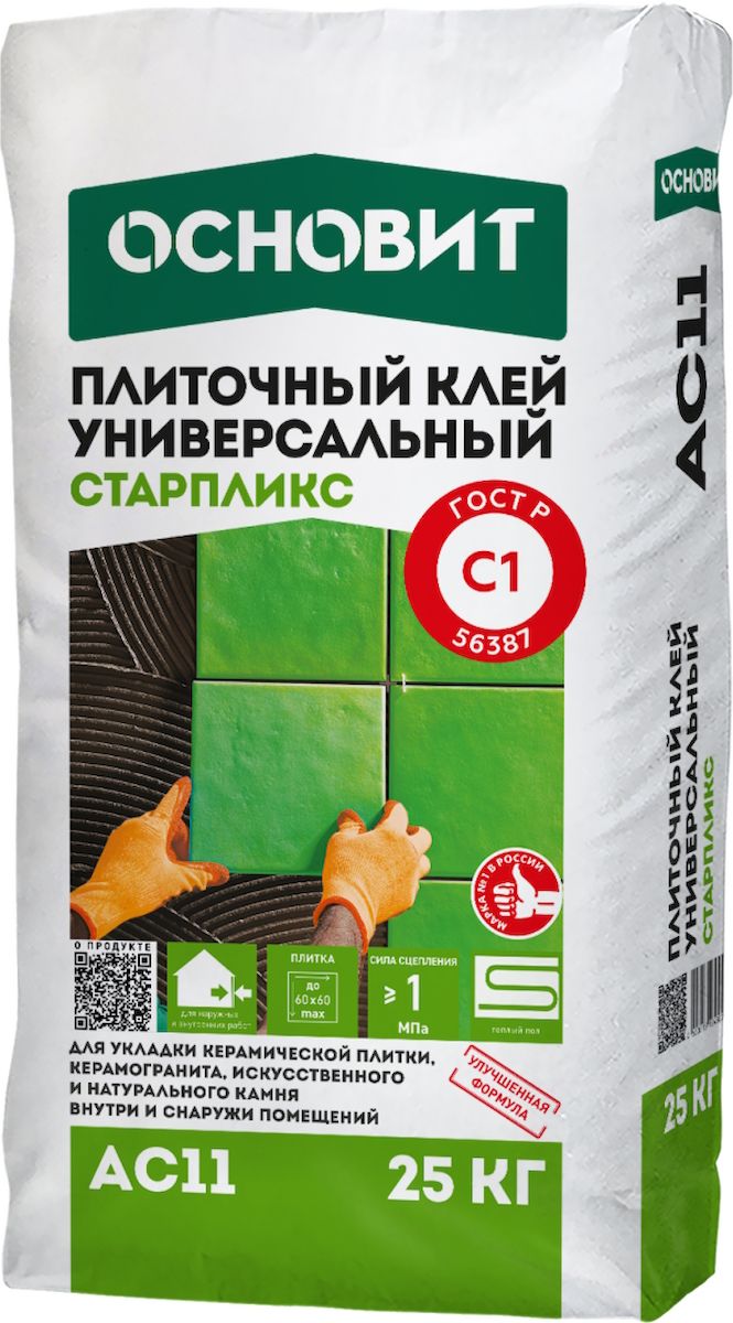 Смесь сухая клеевая на цементном вяжущем C1, ГОСТ Р 56387-2018 . Универсальный плиточный клей ОСНОВИТ СТАРПЛИКС АC11 предназначен для облицовки оснований стен и полов с подогревом керамической плиткой, натуральным и искусственным камнем весом до 600 г/100 см². Для внутренних и наружных работ. Рекомендуемые основания