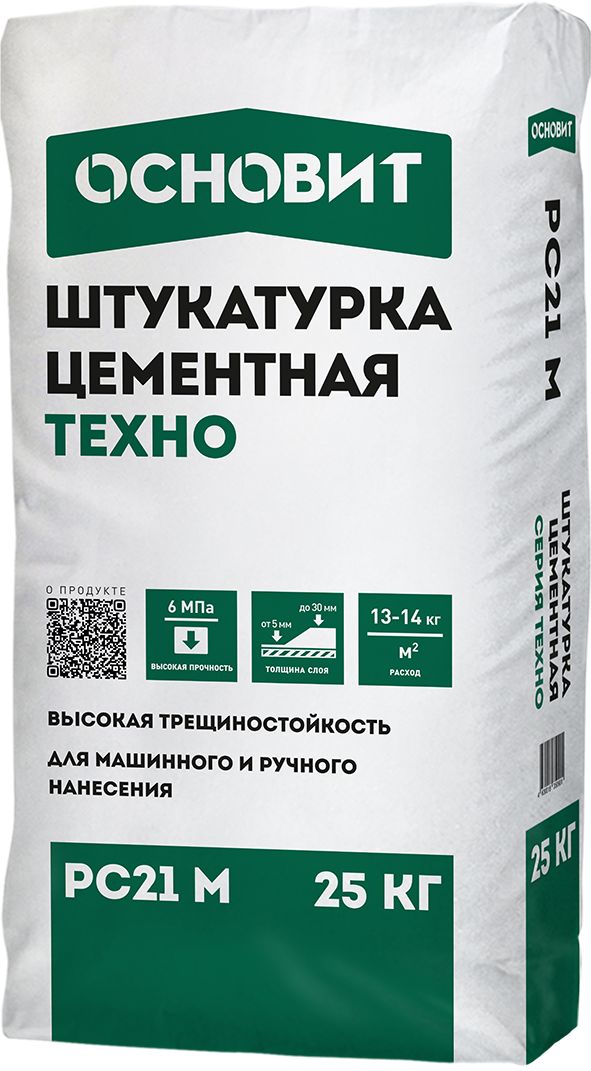 Штукатурка ОСНОВИТ ТЕХНО PC21 M предназначена для выравнивания стен из бетона, кирпича, пено- и газобетона. Рекомендуется для отделки фасадов выше цокольной части и помещений с любой степенью влажности. Для внутренних и наружных работ. Рекомендуемые основания: бетонные, кирпичные, пено- и газобетонные основания, цементные штукатурки.